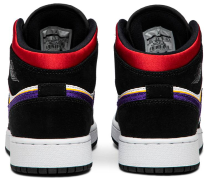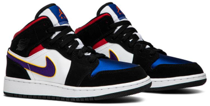 The 1 Mid SE GS 'Rivals' takes the retro hoops silhouette and gives it a color collage celebrating the best of MJ's competitors. Released in late June 2019 for kids . this mid-cut version of the 1985 icon honors the teams that challenged the Bulls for NBA supremacy in the 90s. A blue-and-orange tongue bows to the Knicks while a 'Bred' collar nods to the Trails. Swoosh branding has a purple-and-gold Lakers motif . and a blue toe calls out the Pistons.